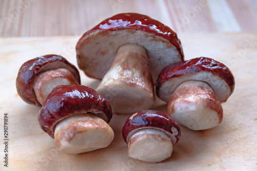 Cep boletus edulis white mushrooms collected in forest before cooking on wooden board background