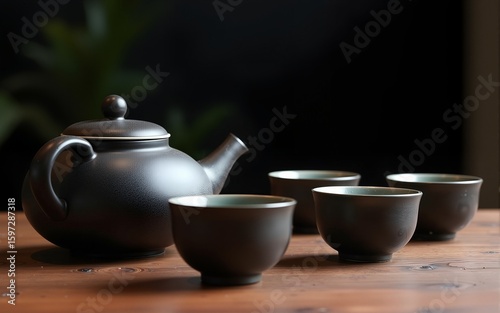 Ceramic tea pot and cups with the famous Photo in the room Chinese tea ceremony on dark background. High quality
