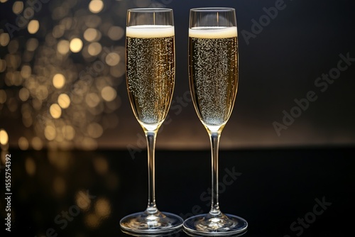Champagne celebration with two elegant flutes filled with sparkling wine on black reflective surface