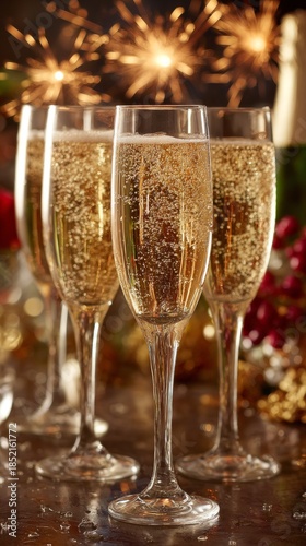 Champagne flutes sparkling with golden bubbles, festive fireworks creating a celebratory atmosphere