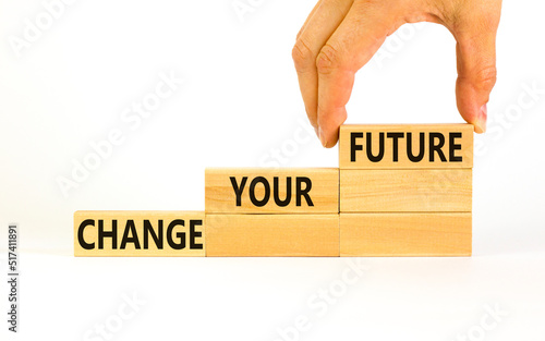 Change your future symbol. Concept words Change your future on wooden blocks on a beautiful white table white background. Businessman hand. Business, financial change your future concept. Copy space.