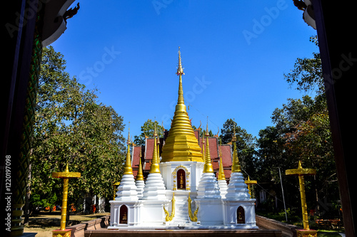 Chapel and Golden Pagoda, Lanna Architecture, Symbols of Buddhism, South East Asia at Doi Sapphanyu Temple, Mae Wang Chiangmai, Northern Thailand