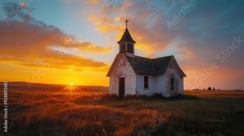Chapel at Sunset: An Old White Wooden Church in Rural Prairie Landscape