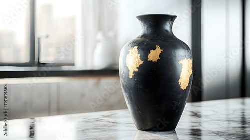Charcoal black clay vase with gold repairs on a minimalist marble countertop, showcasing the blend of traditional and modern kitchen decor