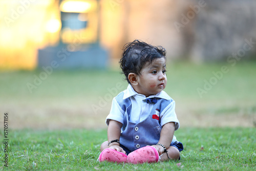 Charming baby boy dressed in a stylish blue and white outfit with a bow tie, sitting inside a decorative woven basket on green grass