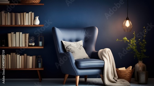 charming, dark, blue, wall, illustration, cosy, reading, nook, armchair, cream, fabric, corner, wooden, table, book, tea, floating, shelf, novel, plant, floor, lamp, warm, gold, glow, inviting, serene, environment, honed, lost, background