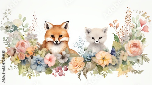 Charming forest animals surrounded by a floral wreath, including fox, owl, deer, and a variety of flowers