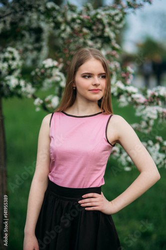 Charming girl in pink blouse and black skirt poses for photographers on the background of beautiful flowering trees. Spring. Sakura.