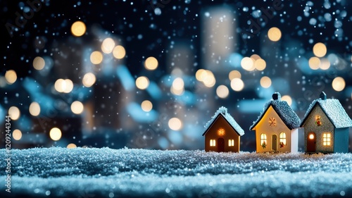Charming miniature houses adorned with snow, creating a whimsical winter wonderland scene.