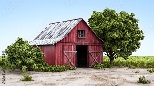 Charming Red Barn Surrounded by Lush Greenery Under Clear Sky