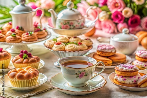 charming, tea, party, table, setting, cake, cupcake, afternoon, time, sweet, dessert, cup, saucer, pastry, sugar, white, cream, pink, food, tasty, homemade, bake, bakery, treat, plate, vintage, retro, english, tradition, classic, elegant, floral, pattern, decorative, flower, rose, bouquet, glasses, teapot, bowl, round, light, cosy, warm, home, no people, nobody