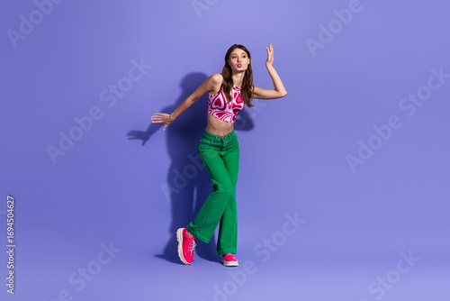 cheerful, experiencing, fun, female, woman, girl, young, model, outfit, fashion, style, casual attire, green, clothing, posing, hair, brunette, purple, background, vibrant, confident, playful, energetic, expression, dynamic, bright, colourful, charming, attractive, beautiful, leisure, student, happy, funny, joyful, funky, advertising, purple background, retro, vintage, summer, girlfriend, dancing, disco, dancer, discotheque, party, positive, stylish, trendy