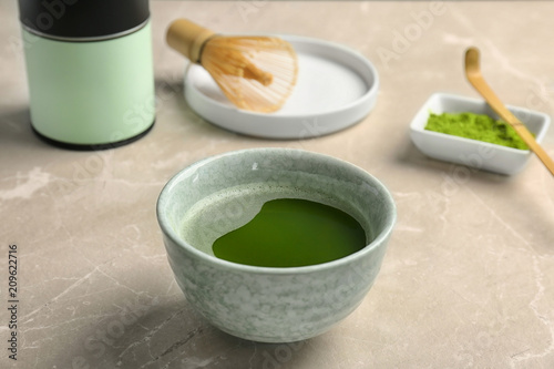 Chawan with fresh matcha tea on table