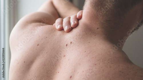 Checking benign moles. Close up detail of the bare skin on a man back with scattered moles and freckles.