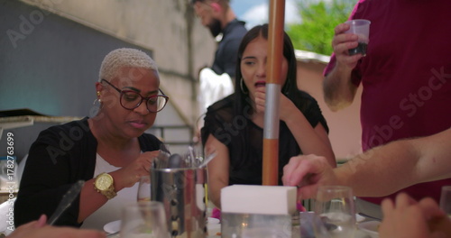 cheerful, backyard, gathering, family, friends, lunch, food, drink, table, chatting, bonding, casual attire, relaxed, celebration, community, socialising, summer, group, event, enjoyment, festive, joyful, activity, day, sunny, sharing