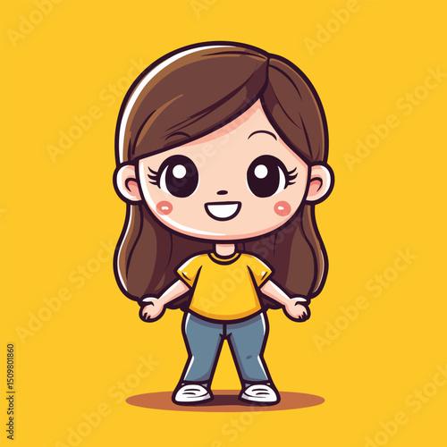 cartoon, girl, happy, cheerful, anime, illustration, character, drawing, cute, children, young, female, fashion, yellow, top, shirt, blue, jean, expression, smile, eye, hair, brown, style, design, graphic, adorable, positive, art, manga, clothing, standing, full body, graphic design, digital artwork