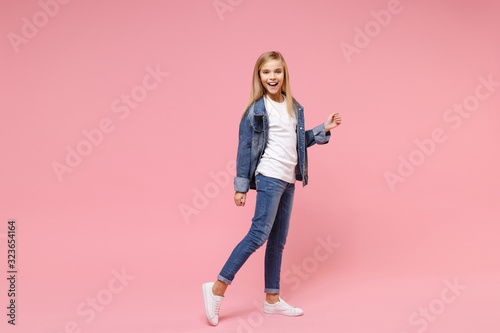 Cheerful cute little blonde kid girl 12-13 years old in denim jacket isolated on pastel pink wall background children studio portrait. Childhood lifestyle concept. Mock up copy space. Looking camera.