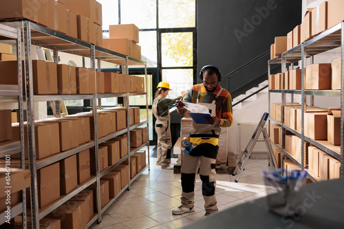 Cheerful employee having fun during storehouse inventory, listening music and dancing while analyzing merchandise checklist. Supervisor wearing protective overall preparing customers orders