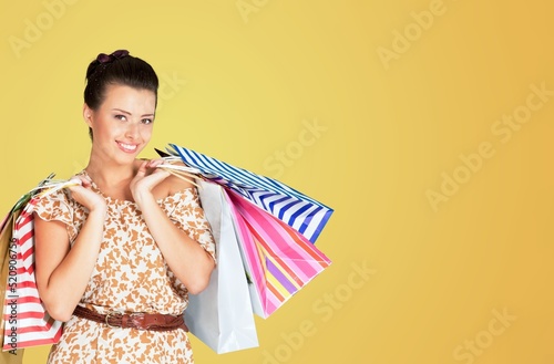 Cheerful happy teen woman enjoying shopping, she is carrying shopping bags