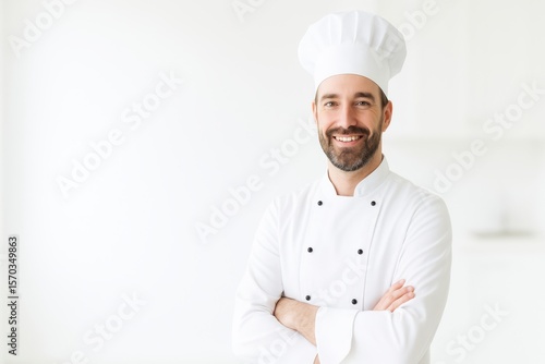 Cheerful male chef wearing a white uniform and hat, standing in a bright kitchen with a welcoming smile, embodying passion for culinary arts and professionalism
