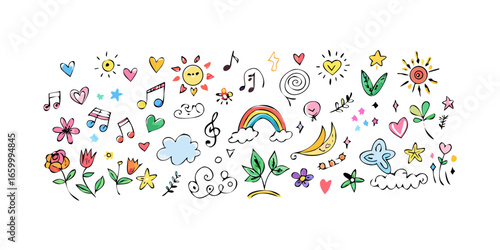 cheerful, many-coloured, vignetting, isolated, cut-out, heart, sun, rainbow, moon, star, flower, leaf, music notes, cloud, happy, playful, whimsical, simple, graphic, design, element, decorative, art