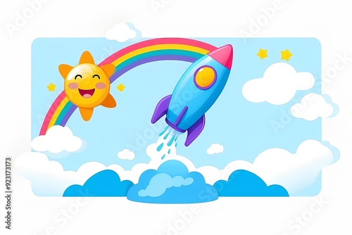 cheerful rocket ship soaring through a magical rainbow and sunny sky, capturing the imagination with a bright and joyful adventure for kids