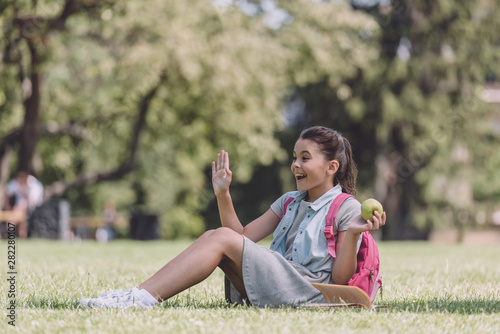 cheerful schoolgirl holding apple and waving hand while sitting on lawn in park