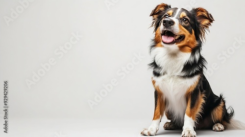 Cheerful Sitting American Shepherd panting and looking away isolated on white : Generative AI