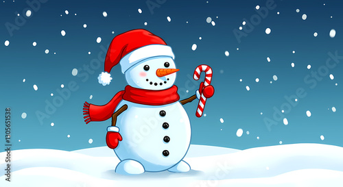 snowman, red scarf, candy cane, winter holiday, christmas decoration, holiday spirit, winter landscape, christmas season, digital illustration, holiday greeting, happy holiday, vector, christmas