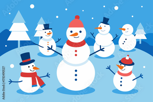 snowman, winter, christmas, holiday, snow, illustration, vector, cartoon, festive, season, happy, cute, landscape, tree, cold, hat, foulard, december, new year, greeting, celebration, frost, playful, childhood, merry, blue, white, scene, weather
