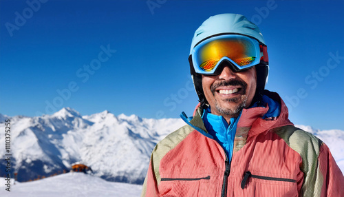 Cheerful South American man enjoying a sunny day of skiing with mountains in the background wearing reflective ski goggles and a bright jacket