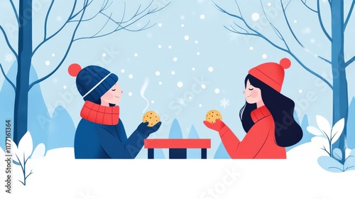 Cheerful Winter Scene with Two Friends Enjoying Cookies and Warm Beverages in a Snowy Landscape Surrounded by Blue Trees and Soft Snowflakes