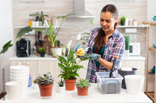 Cheerful woman taking care of the flowers at home in cozy kitchen. Using fertil soil with shovel into pot, white ceramic flowerpot and plants prepared for replanting for house decoration caring them