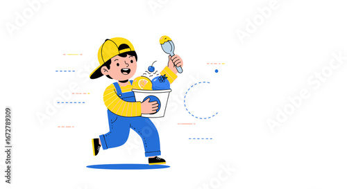 ice, cream, man, children, boy, men at work, serving, dessert, sweet, delicious, colourful, happy, cheerful, joy, fun, summer, snack, refreshing, treat, eat, food, cartoon, illustration, youth, young, drawing, bucket, scoop, berry, lemon, blueberry, cap, overall, delivery, smiling, holding, run, active, taste, refreshment, deliciously, time, enjoyment, playful, delightful