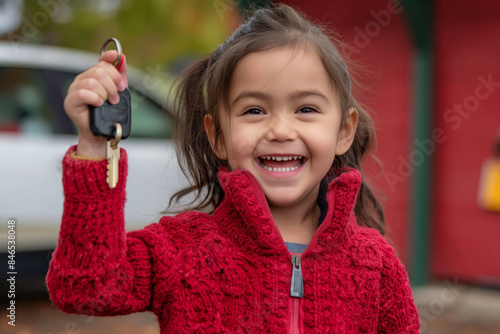 Cheerful young girl in a red jacket smiling broadly as she holds up a car key outdoors, showcasing excitement and happiness