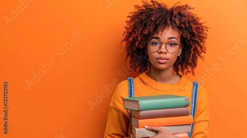 Cheerful young student with large glasses balancing a stack of books on her head against a vibrant orange backdrop.