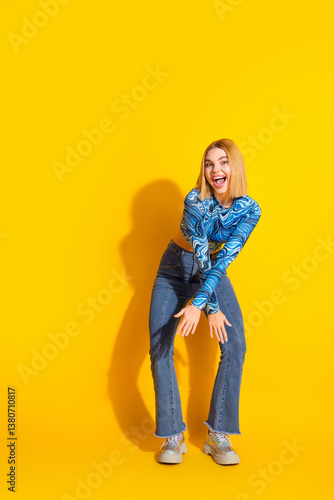 Cheerful young woman in stylish outfit posing against vibrant yellow vertical background showcasing fashionable casual wear