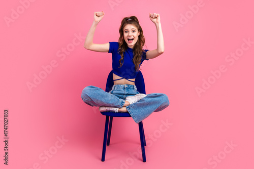 female, woman, young, girl, happy, smile, blue, pink, background, joyful, excited, trendy, fashion, cheerful, brunette, casual attire, chair, outfit, portrait, charming, beautiful, lovely, attractive, summer, spring, coiffure, ponytail, denim, jean, positive, funny, colourful, expressive, energy, vibrant, posing, bright, dynamic, girlish, cool, joy, energetic, confident, style, model, top, glamour, relaxing, resting, sitting