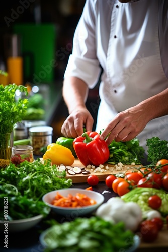 bell pepper, chef, chopping, cooking, cut, food, fresh, healthy, ingredient, kitchen, knife, male, man, meal, one person, paprika, pepper, person, prepare, preparing, professional, red, salad, slice, vegetable, vegetarian, white, wooden board