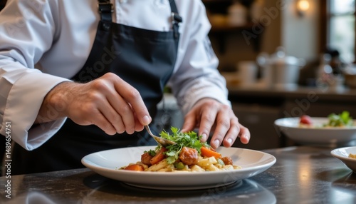 Chef Garnishing a Plate of Gourmet Pasta with Fresh Herbs in a Modern Restaurant Kitchen