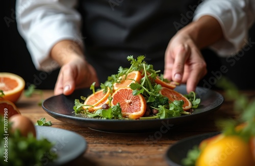 Chef hands decorate gourmet salad with citrus segments and greens on dark plate. Fresh ingredients and dressing on wooden table. Pro cooking in kitchen.