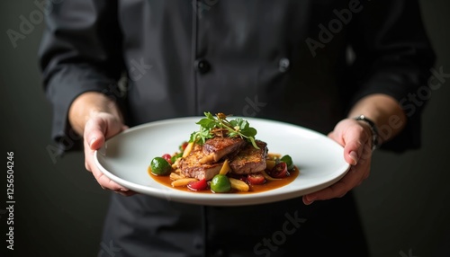 Chef holds plate of artfully plated food. Gourmet dish with meat, vegetables, microgreens presented on white plate. Fine dining experience in luxury restaurant. Food presentation culinary skill.