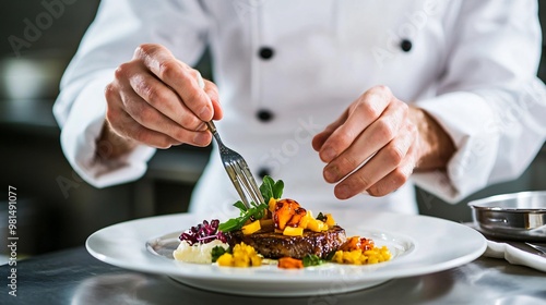 chef in a well-equipped kitchen arranging microgreens on a plated dish with precision, copy space