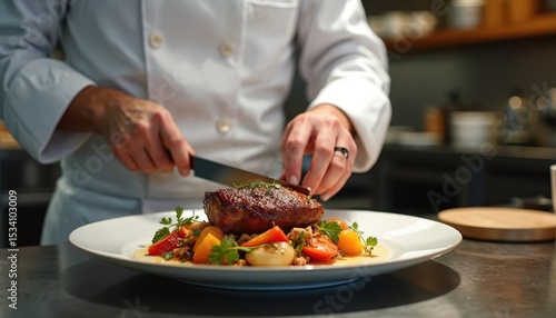 Chef in white uniform cuts gourmet meal. Plate with meat, vegetables, elegant culinary art. Stylish kitchen, fine dining, restaurant food, healthy eating, pro cooking skill.