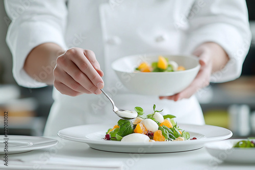 chef is carefully plating colorful salad with fresh ingredients, showcasing culinary skills and attention to detail. vibrant colors and textures create appealing presentation