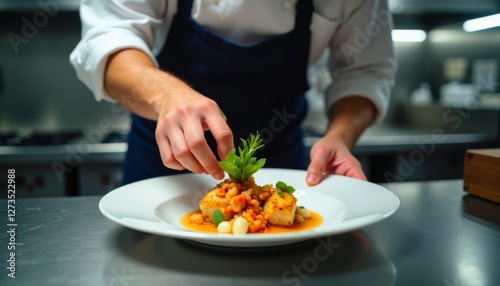 Chef plating a gourmet dish with herbs and sauce. Exquisite presentation, showcasing culinary artistry and attention to detail in a professional setting.