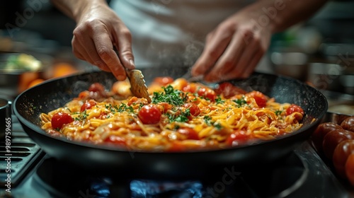 pasta, tomatoes, chef, cooking, food, pan, kitchen, culinary, italian, gastronomy, cookery, receipe, delicious, appetising, epicure, favor, flavorful, tasty, savoury, dinner, lunch, meal, vegetable, tomatoes, cherry, sauce, spaghetti, noodle, parsley, hand, red, preparation, professional, eatery, catering, dining, appetence, taste, bud, skill, art