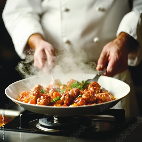 chef, cooking, food, meatball, cookery, kitchen, dinner, preparation, receipe, steam, professional, eatery, epicure, ingredient, plate, fresh, delicious, hand, culinary, aromatic, seasoning, sauce, tomatoes, parsley, meal, heat, savoury, culinary arts, favor, dish, closeup, portion, plating, kitchen utensile, catering, tradition, presentation, warm, tasty, skill