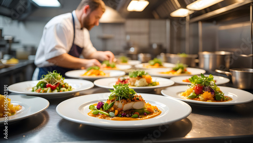 Chef preparing gourmet dishes in a professional kitchen