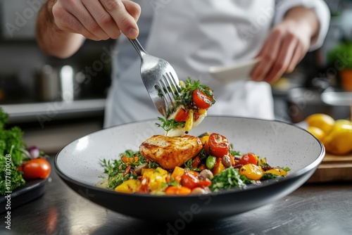 Chef preparing grilled chicken salad with vegetables in a professional kitchen